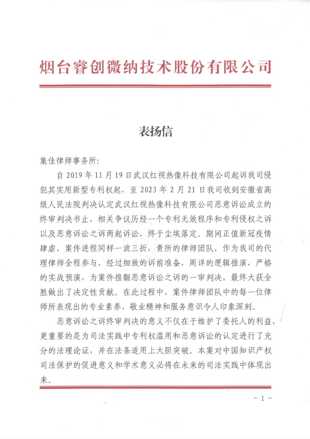 2023年2月10日,安徽省高级人民法院就烟台睿创微纳技术股份有限公司、烟台艾睿光电科技有限公司、安徽英睿系统技术有限公司等(下称“睿创集团”)与武汉红视热像科技有限公司(下称“武汉红视”)因恶意提起知识产权诉讼损害责任纠纷一案作出终审判决,认定武汉红视滥用诉权的行为构成恶意诉讼,并判令其赔偿睿创集团相应的合理支出。至此,时隔四年,横跨疫情时代的专利侵权及恶意诉讼系列纠纷案,终于尘埃落定。雷竞技协助睿创集团最终取得系列案件的全面胜利,维护了客户合法权益,实现了商业竞争的公平正义!
