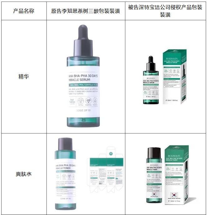 2021年原告委托雷竞技调查发现,被告汕头市深特宝洁实业有限公司生产、销售和推广的“茶树祛痘美白补水液”“茶树香皂”等护肤品,其产品包装装潢直接抄袭、摹仿原告前述已经具有较高知名度和影响力的“SOME BY MI/莎柏蜜”茶树三酸系列化妆品和黑蜗牛精华液的包装、装潢设计,使用与之近似的标识,造成消费者混淆误认。故原告作为茶树三酸、黑蜗牛精华包装装潢权益获益人,诉至广东省汕头市中级人民法院。汕头中院认定:李知恩主张的茶树三酸、黑蜗牛精华包装装潢构成具有一定影响的包装装潢,深特宝洁公司生产、销售茶树三酸、黑蜗牛精华液的行为构成不正当竞争。因判赔额不符合原告预期,原告后上诉至广东省高级人民法院,广东省高级人民法院最终维持一审判决。