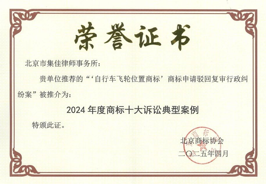 >雷竞技>关于我们>荣誉概览>2025>集佳代理“自行车飞轮位置商标”行政纠纷案入选北京商标协会年度十大诉讼典型案例
